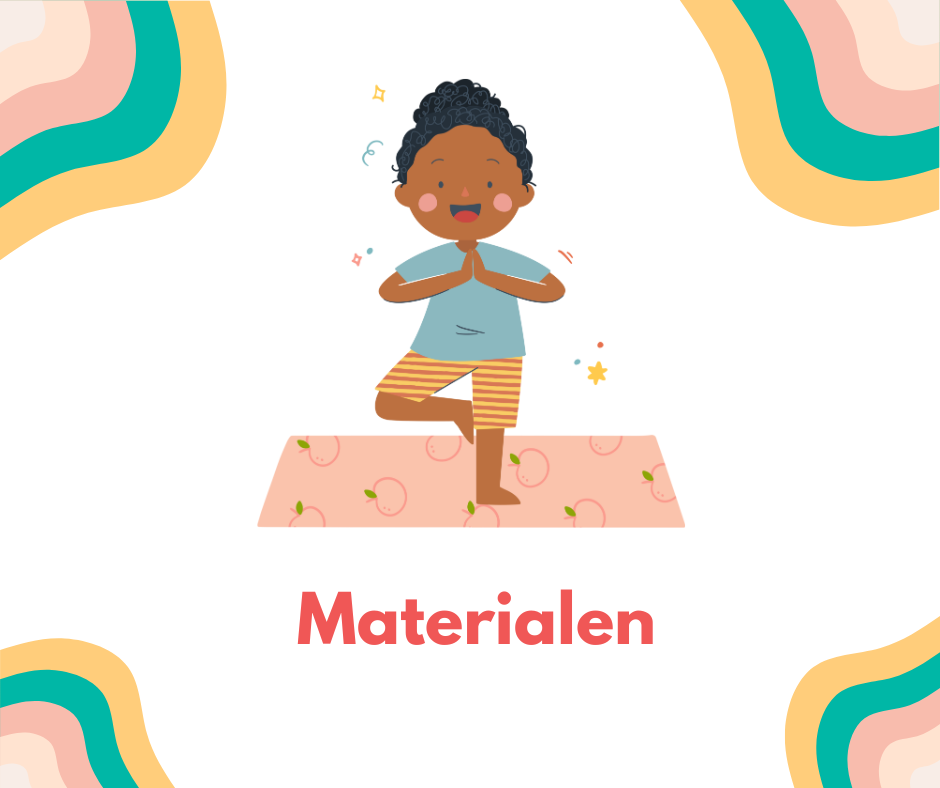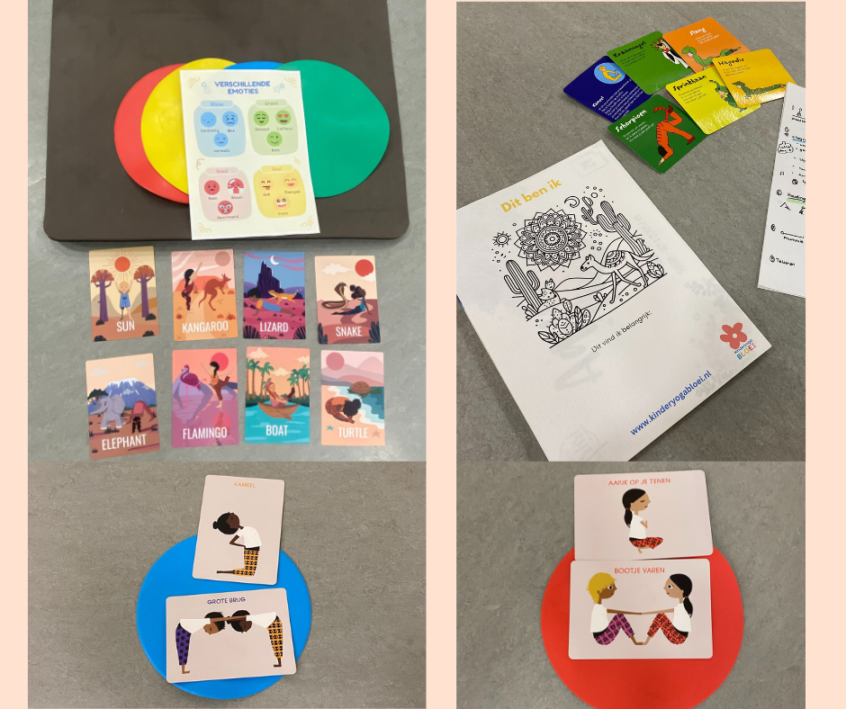We maken in de lessen vaak gebruik van materialen zoals werkbladen, yoga houding kaartjes en fysieke stippen of blokken.